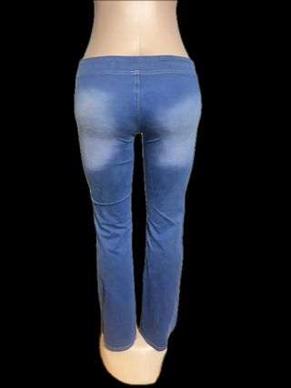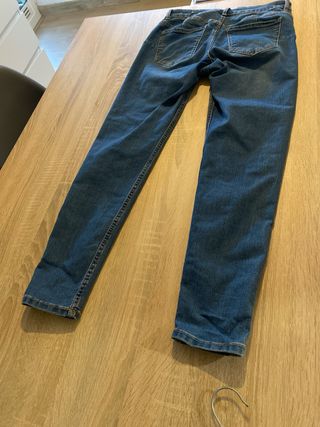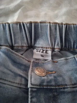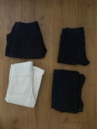 Conjunto de pantalones de maternidad cómodos y versátiles. 1- Pantalon vaquero azul de corte acampanado. 2- Pantalones vaqueros azules ajustados con detalles desgastados. 1- Pantalones negros ajustados. 1- Pantalon vaquero azul corto para verano. De Lefties y Shein, en buen estado. Talla L/42