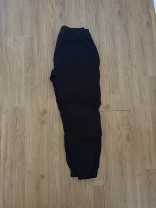 Pantalones de estilo cargo en color negro. - Diseño con múltiples bolsillos. - Cintura con cordón ajustable. - Detalle de hebillas y tiras. - Puños elásticos en los tobillos.
