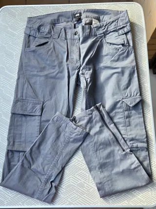 Pantalón estilo cargo en tono gris. Presenta un diseño moderno y funcional. - Bolsillos laterales con solapa. - Cremalleras en los bajos de las perneras. - Cintura con trabillas para cinturón.