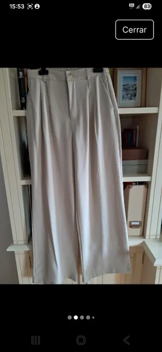Pantalón elegante de color beige con un diseño sutil de tachas brillantes. - Diseño con tachas pequeñas. - Corte ancho y fluido.