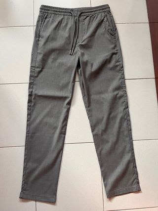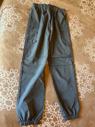 Pantalones cómodos de color gris, perfectos para el día a día. - Cintura con cordón ajustable. - Bolsillos laterales. - Puños elásticos en los tobillos.