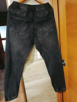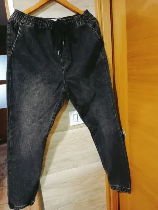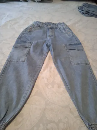 Pantalón vaquero cargo con puño en los tobillos. Cintura con goma. Talla S Bolsillos delanteros. Tela elástica. Largo 92 cm. Puños ajustados en los tobillos. Apenas usado.