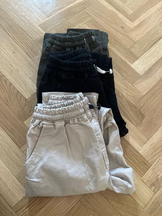 Pack de tres pantalones, dos de color negro y uno blanco. - Pantalones negros con cintura elástica. - Pantalones negros tipo vaquero. - Pantalones blancos. Bershka y Stradivarius