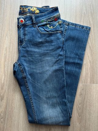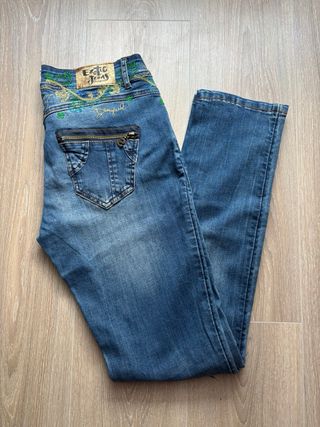 Pantalón vaquero con un diseño único y detalles bordados. - Cintura con botón y cremallera. - Bolsillos delanteros con bordado floral. - Costuras reforzadas.