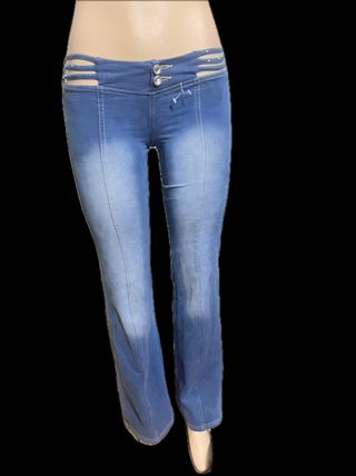 Pantalón vaquero de corte flare con detalles modernos. - Cintura alta con aberturas laterales. - Adornos de pedrería en las aberturas. - Cierre de doble botón. - Costuras decorativas. - Efecto desgastado.