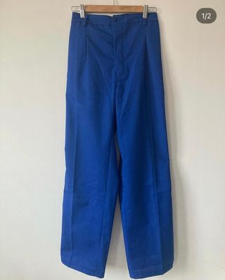 Pantalón de trabajo de corte clásico y color azul intenso. Talla 36 cintura por detrás elástica Sirve para talla 38 incluso un poco más - Diseño con pinzas delanteras. - Cintura con trabillas para cinturón. - Cierre de cremallera y botón. Madr in Spain
