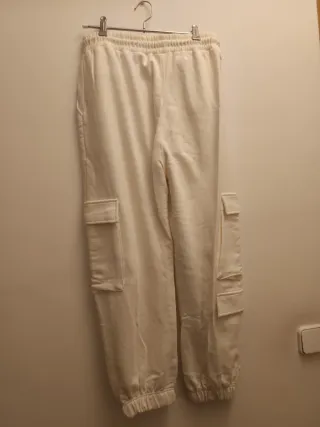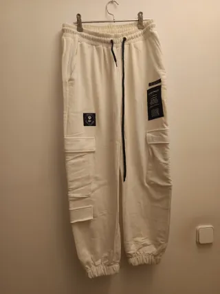Pantalones de chándal de color blanco con un diseño moderno. - Cintura con cordón ajustable. - Bolsillos laterales. - Bolsillos cargo en los laterales. - Puños elásticos en los tobillos. - Detalles de parches decorativos.
