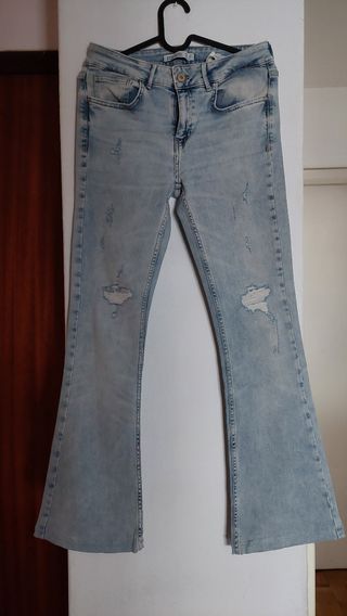 Vaquero skinny con acabado en campana. Se le ha borrado la etiqueta, pero es una talla xs-s. Es bastante elastico, equivale a una 34. Para más referencia, yo mido 1,51cm y peso 48kg.