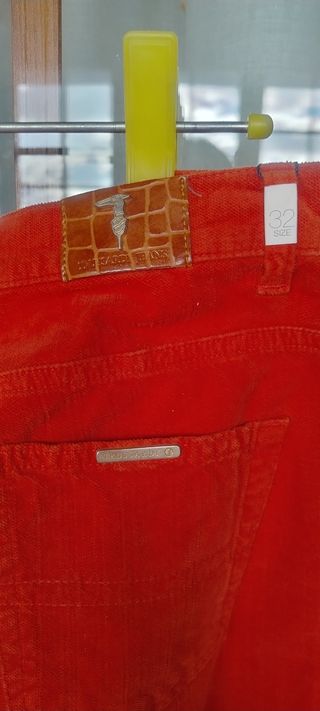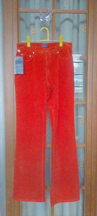 Pantalones de Trussardi en un color rojo anaranjado (aunque en foto parecen más rojos). Cintura baja, ajustados a la cadera y pierna ancha. Tallan como una 42 más o menos