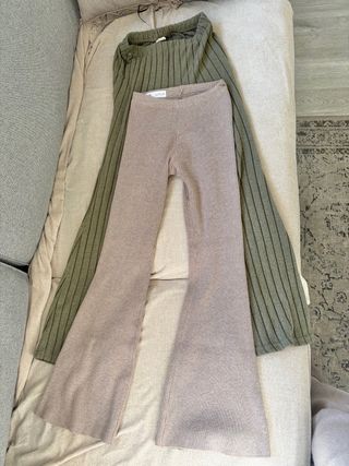 Conjunto de dos piezas de Stradivarius. Talla pequeño aunque es una M. Por un lado tiene el cuello alto sin mangas y por otro lado los manguitos acampanados para poner encima