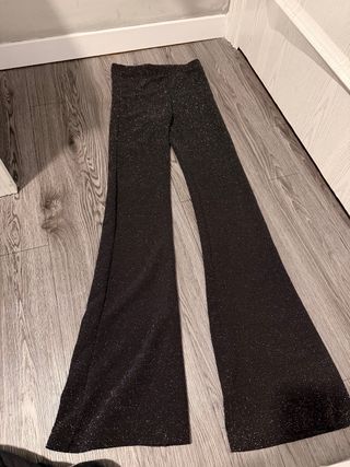 Pantalones acampanados con un toque brillante, perfectos para salir. - Diseño ajustado en la parte superior. - Piernas acampanadas. - Tejido con brillos plateados.