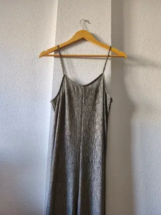 Mono largo con tirantes finos y tejido brillante plateado. - Diseño con textura. - Corte recto. - Pantalón acampanado