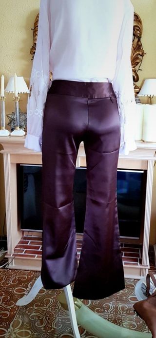Pantalón de vestir diseño acampanado alto de cintura tejido de fantasía, raso o similar con mucha caída, color marrón chocolate con algo de elastan talla/38, medidas: Cintura-38 Largo-82 ( desde la entrepierna ) Largo- 1'03 ( desde la cintura ) Cadera- 51Pantalón de vestir diseño acampanado alto de cintura tejido de fantasía, raso o similar con mucha caída, color marrón chocolate con algo de elastan talla/38, medidas: Cintura-38 Largo-82 ( desde la entrepierna ) Largo- 1'03 ( desde la cintura ) Cadera- 51