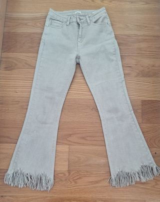 Preciosos pantalones vaqueros acampanados de la marca Renatta. Son de color beige y tienen un diseño con flecos en el bajo. - Talla: (Especificar talla) - Material: Mezclilla - Estilo: Acampanados con flecos