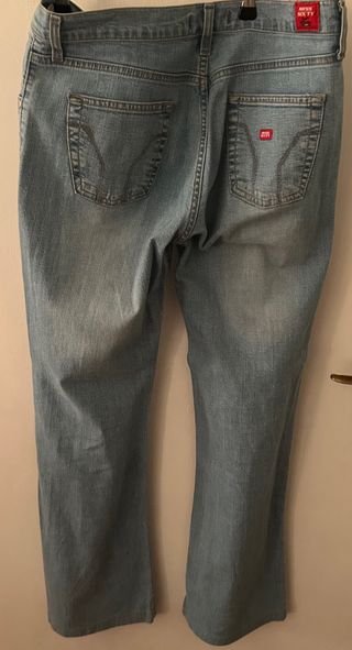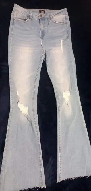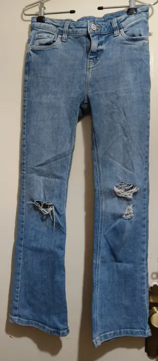 Pantalón vaquero de corte acampanado. - Diseño de cinco bolsillos. - Cierre de cremallera y botón. -Falta botón de abrochar -vaqueros delgados