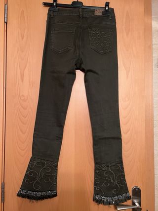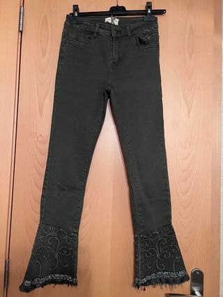 Pantalones vaqueros de la marca Nekane en color kaki. Son nuevos y vienen sin etiquetas. - Diseño con bordados decorativos en los bajos. - Bajo acampanado con flecos. - Detalle de bordado en el bolsillo delantero.