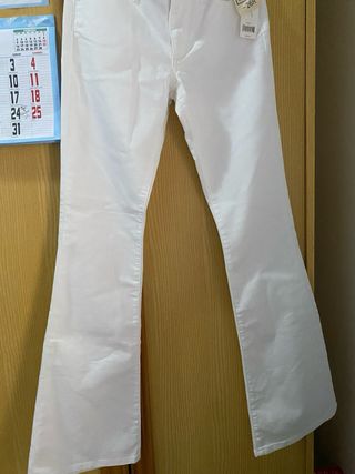 Pantalón de corte flare en color blanco. Talla 26R. - Diseño de cinco bolsillos. - Cierre de botón y cremallera. - Trabillas para cinturón. medidas cintura: 35 cm largo : 102 cm