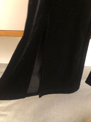 Pantalón de terciopelo negro con un diseño acampanado y una pequeña abertura en la parte delantera. - Tejido de terciopelo suave. - Pierna acampanada. - Abertura frontal.