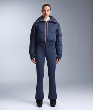 Pantalón de corte flare con tejido elástico y resistente al agua. - Diseño de cintura alta. - Dos bolsillos frontales con cremallera. - Cierre de cremallera y botón. - Piernas acampanadas.