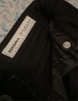 Pantalón de jean Stradivarius en color negro, talle 36. - Corte acampanado. - Diseño de cinco bolsillos. - Cierre de cremallera y botón.