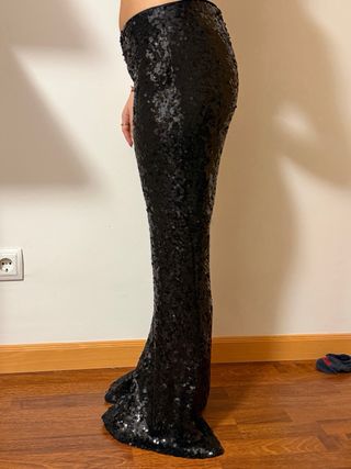 Pantalones negros de corte acampanado con detalles brillantes. - Diseño con adornos de pedrería. - Piernas amplias. - Cintura elástica.