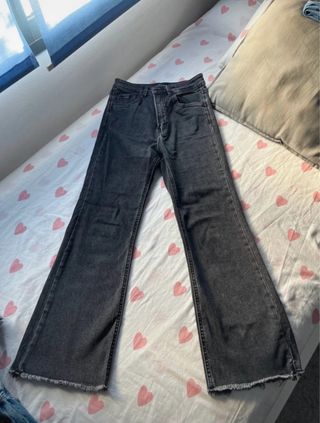 Pantalones vaqueros de corte acampanado. - Color negro. - Diseño de cinco bolsillos. - Cintura alta. - Bajo deshilachado.