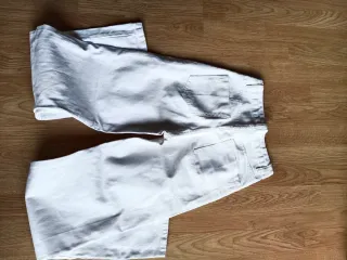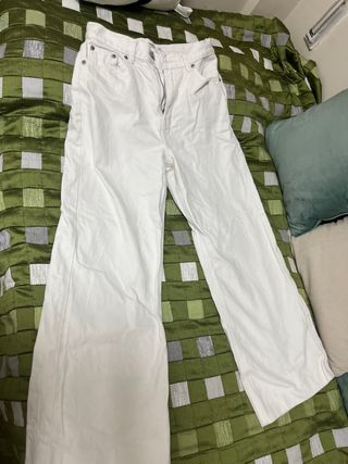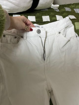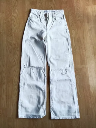 Pantalón vaquero de corte ancho en color blanco de la marca Bershka talla 36 - Acampanado - Cierre de cremallera y botón. - Con rotos en rodillas