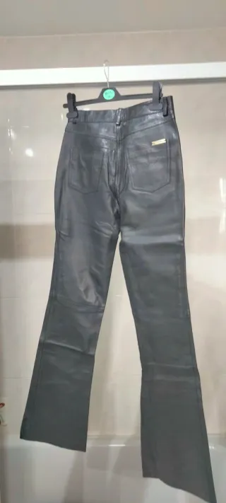 Pantalones negros de efecto piel con corte flare. - Cintura alta con trabillas. - Cierre de cremallera y botón. -Estilo flare o acampanado -Nuevos, usados una vez.