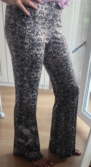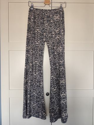 Pantalones acampanados con un estampado chulo en tonos grises y negros. Son muy cómodos y favorecedores. - Estampado original. - Corte acampanado. Malla elástica acampanada, estampada, pone talla M pero vale para más talla, yo llevo XL (foto). La cintura es muy elástica. 105 cm de largo.