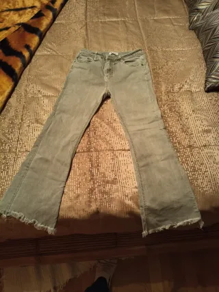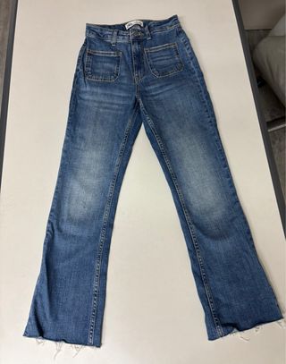 Pantalones vaqueros de tiro bajo con un lavado claro. - Diseño acampanado. - Costuras visibles en los laterales. Me van grandes los he usado unas cuantas veces pero estan como nuevos. Acepto intercambio por estos mismos vaqueros en talla 36.