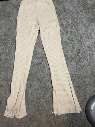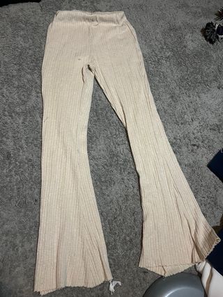 Pantalones acampanados de canalé en color beige. Tienen un diseño moderno y cómodo. - Tejido de canalé. - Pierna acampanada. - Bajo deshilachado.