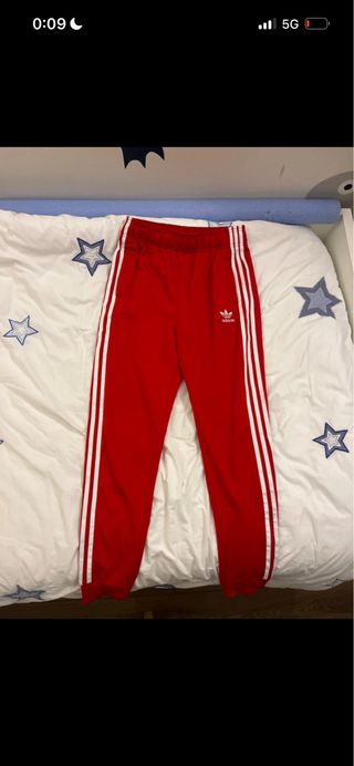 Pantalón deportivo Adidas de color rojo. - Diseño clásico con tres rayas blancas a los lados. - Logo de Adidas bordado en la parte frontal.