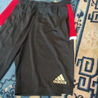 Pantalón corto deportivo de la marca Adidas. - Diseño con detalles en rojo y blanco. - Tres rayas doradas en el lateral. - Logo de Adidas en dorado.