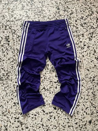 Pantalón deportivo **Adidas Originals original estilo trackpants / streetwear con el clásico diseño de 3 rayas. Modelo en color morado con paneles blancos y rayas amarillas, acompañado del icónico logo Trefoil en la pierna. Diseño muy popular en estética retro, vintage sport y streetwear, perfecto tanto para outfits casual como para uso deportivo. Interior suave y cómodo, ideal para el día a día. ✔ Cintura elástica con cordón ajustable ✔ Bolsillos laterales con cremallera ✔ Logo Trefoil Adidas Originals ✔ Diseño clásico 3 stripes Prenda en muy buen estado general, sin defectos importantes. 📏 Talla: M 📦 Envío disponible o entrega e