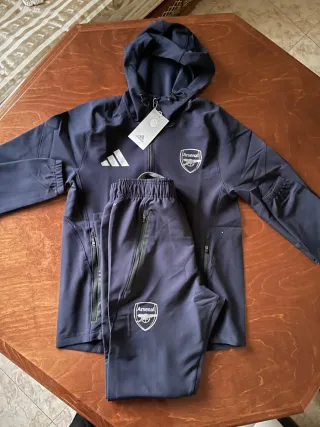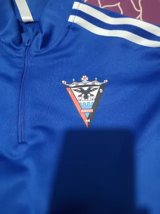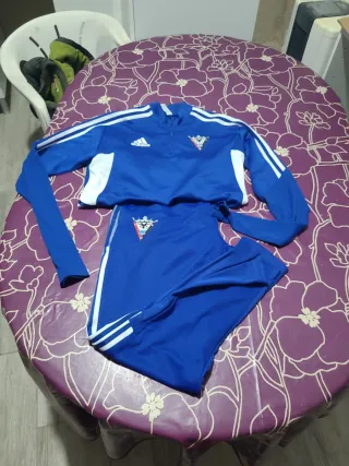 Conjunto de chándal del Mirandés. - Chaqueta con cremallera. - Pantalón. - Diseño con franjas blancas en mangas y perneras. - Escudo del equipo.
