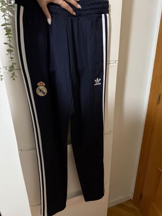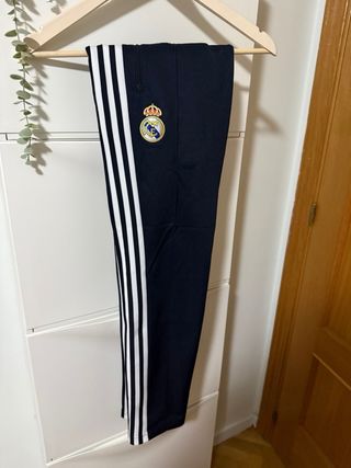 Pantalón de chándal con el escudo del Real Madrid y el logo de Adidas. - Diseño clásico con tres rayas blancas a los lados. - Cremalleras en los bolsillos.