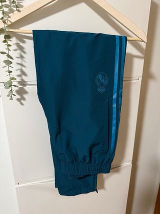 Pantalón de chándal del Real Madrid. - Diseño con las icónicas tres rayas laterales. - Escudo del equipo y logo de la marca. - Color verde azulado. - Bolsillos