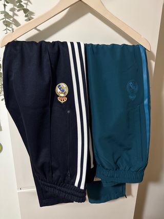 Conjunto de dos pantalones de chándal del Real Madrid. - Un pantalón es azul marino con detalles blancos. - El otro pantalón es de color verde azulado con detalles en azul claro. - Ambos pantalones tienen el escudo del Real Madrid. - 1 pantalón 18€, los dos 30€