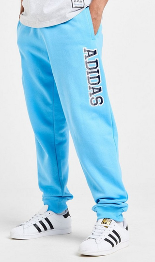 Pantalones deportivos Adidas de color azul. - Diseño con logo y texto. - Estilo casual y cómodo.