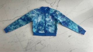 Conjunto deportivo de Adidas para mujer, con un llamativo estampado. - Chaqueta con cremallera completa. - Pantalón largo. - Diseño en tonos azules y turquesas.