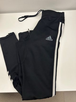 Pantalones deportivos Adidas de color negro con el icónico diseño de tres rayas blancas a los lados. - Cintura elástica con cordón. - Puños ajustados en los tobillos. - Pequeño logo de Adidas bordado.