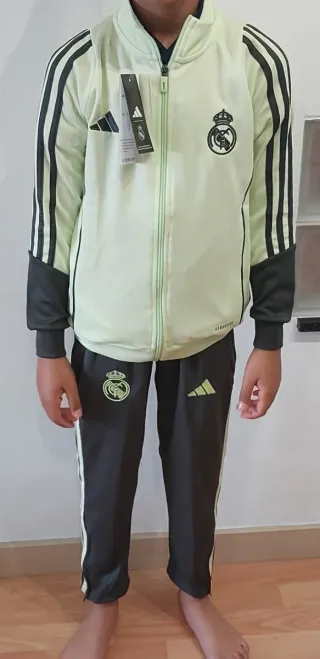 Conjunto deportivo de chándal del Real Madrid para niño, entrenamiento temporada 2025/2026. Lo vendo porque a mi hijo le queda justo. Es talla 125-135cm - Chaqueta con cierre de cremallera. - Pantalón largo. - Diseño con detalles en contraste.