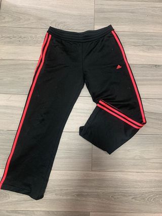 Pantalones deportivos Adidas, en color negro y naranja. Están en buen estado y son ideales para hacer deporte. - Diseño deportivo con tres rayas naranjas a los lados. - Cintura elástica con cordón para ajustar. - Bajos con cremallera.