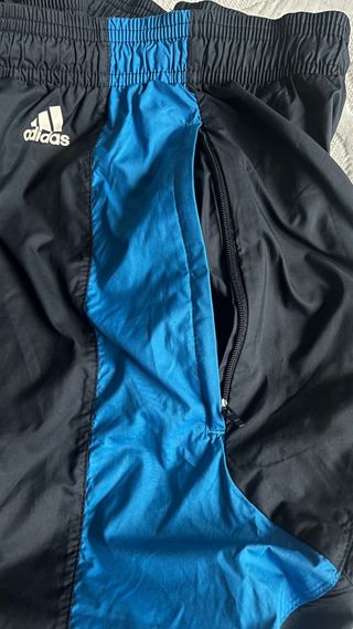Pantalón chándal Adidas para chico, en color negro. Talla M. Edtá en buen estado, aunque como es de poliester tiene 2 pequeños enganchones como muestro en la fotografia número 4: - Tiene dos rayas blancas a los lados. - Tiene bolsillos laterales con cremallera. - Tiene aperturas con cremallera en el tobillo.
