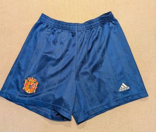 Pantalón de la selección española de fútbol 1998, color azul oscuro. Medidas 31cm en la cintura (es un elástico que se puede estirar hasta los 40cm). De alto mide 34cm. Están en perfecto estado, sin desperfectos ni marcas de uso, llevan años guardados en un cajón.