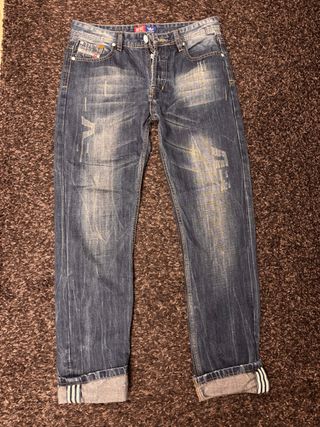 Pantalón vaquero de corte recto, con un diseño desgastado y detalles de la marca. - Cintura con cierre de botones. - Bolsillos delanteros y traseros. - Dobladillo en los bajos con detalle de rayas. Apenas usado Medidas prenda Cintura 40cm Cadera 55cm Largo 110cm.