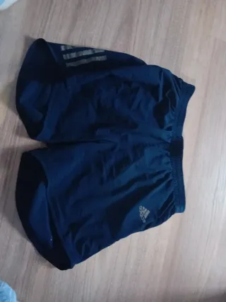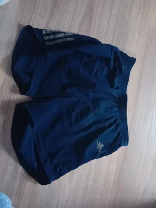 Conjunto de dos pantalones cortos deportivos Adidas. - Diseño en color azul y negro - Talla XL (46/56). - Detalle de franjas blancas laterales. - bolsillos de cremallera - 10€ por pantalón