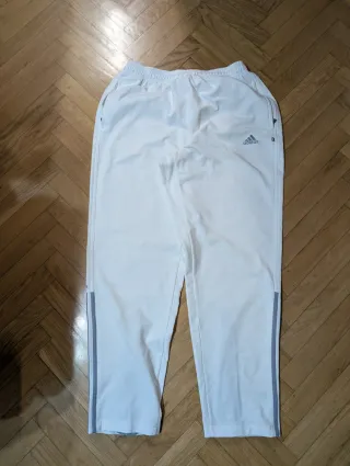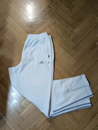 Pantalón blanco con el logo de Adidas cosido en gris. Los bolsillos tienen cremalleras. Presenta las tres rayas de Adidas en color gris, además de un logo pequeño a la altura de la rodilla en la pierna derecha. También tienen una cremallera por la parte trasera que sirve para abrir más el pantalón. Talla XL. Pantalón tipo jogger. En muy buen estado, ya que solo los he usado una vez. Ante cualquier oferta o duda, escríbeme sin problema. También hago packs con más artículos de mi perfil.