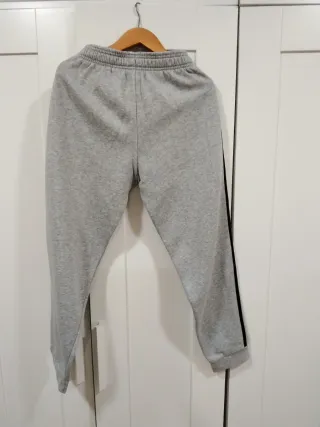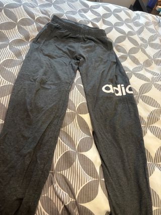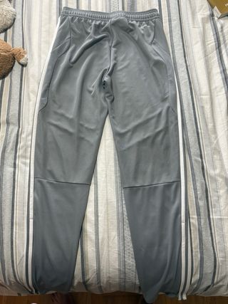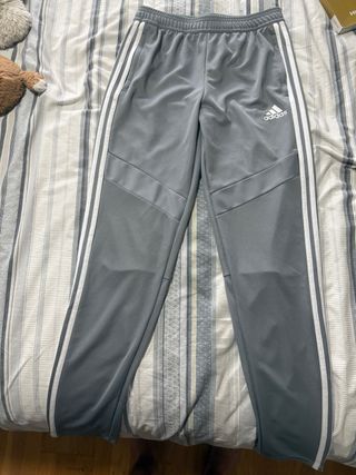 pantalón de chándal Adidas original en color gris con rayas blancas. Está en excelente estado, muy poco uso. > * Talla: XL de niños (equivalente a 15-16 años / 176 cm). > * Tecnología: AEROREADY para mayor transpirabilidad y comodidad al hacer deporte. > * Detalles: Logo bordado en blanco, bolsillos laterales y cintura elástica. > * Uso: Ideal para fútbol, entrenamiento o uso diario.