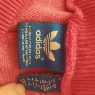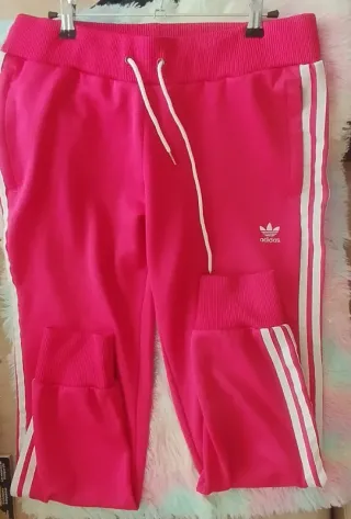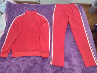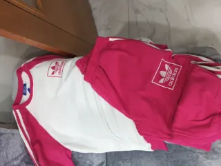 Conjunto deportivo Adidas de dos piezas. - Chaqueta con cremallera completa. - Pantalón a juego. - Diseño con las icónicas tres rayas. Más una cuarta en rosa. Puesto en dos ocasiones, lo compré en Noviembre, pero la chaqueta es corta para mi.